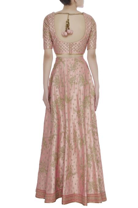 Buy_Vandana Sethi_Peach Raw Silk Embroidered V-neck Zari And Zricon Bridal Lehenga Set_Online_at_Aza_Fashions
