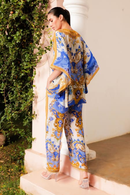 White embellished butterfly top featuring a plunge V-neck and cape sleeves with a Santorini sunkiss floral swirl print. Paired with matching palazzo pants, both made from viscose silk.