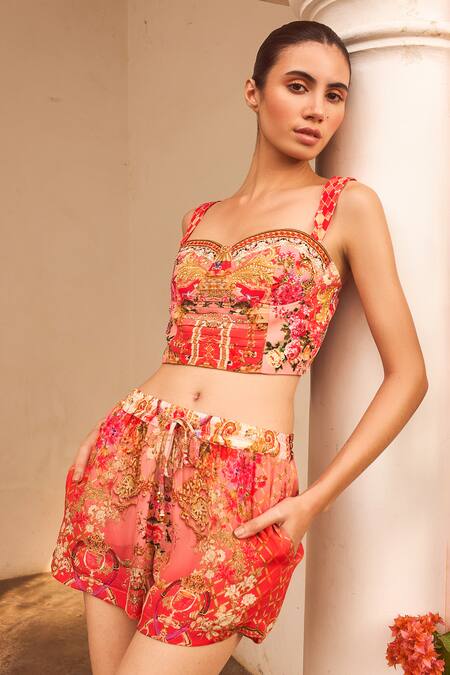 Pink bustier top featuring front pleats, lotus bloom prints & crystal hand embellishments. Paired with coordinating printed shorts and a long wrap dress with a tassel-tie closure.