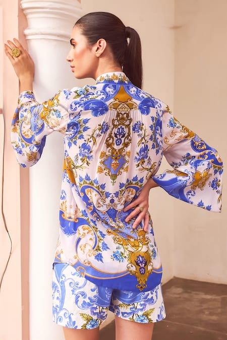 White shirt featuring Santorini sunkiss floral swirl print with a mandarin collar. Paired with a matching crystal embellished bustier, shorts, hairband, and beach bag.