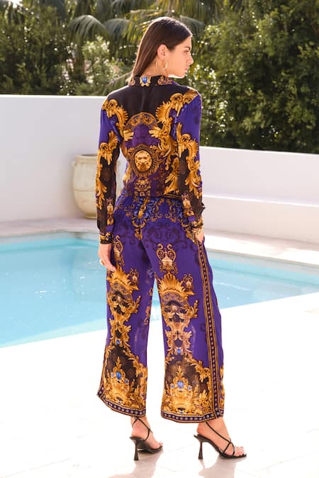 Blue Viscose, Silk Collared Swirl Print Shirt With Palazzo
