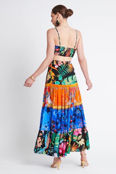 Multicolored tiered maxi skirt featuring a tropical floral print on a viscose silk base