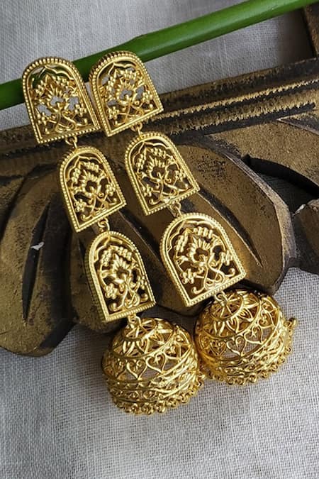 Embossed floral motifs on each tier, Filigree detailing throughout the design, Bead drops enhancing the jhumka style