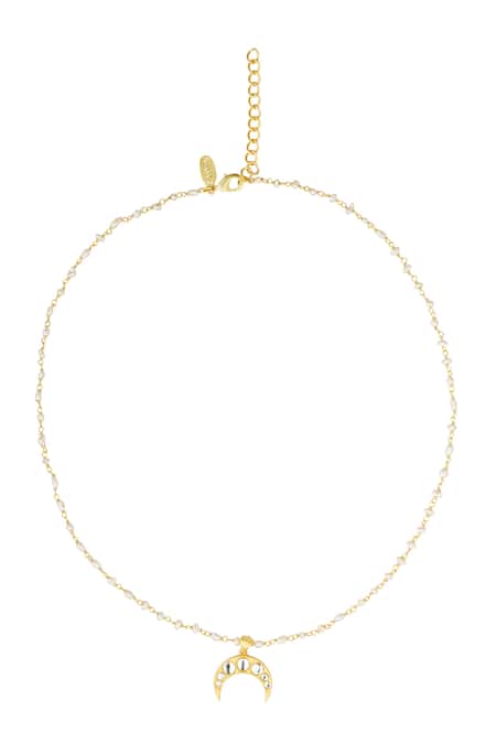 Gold moon shaped pendant necklace featuring mirror polki and fresh water pearl embellishments