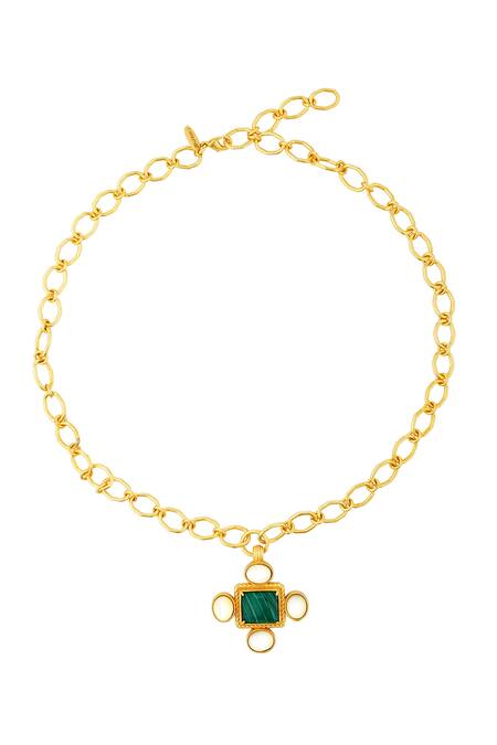 Central malachite motif surrounded by pearls, Adjustable closure for a customized fit, 22kt gold plating for a luxurious finish