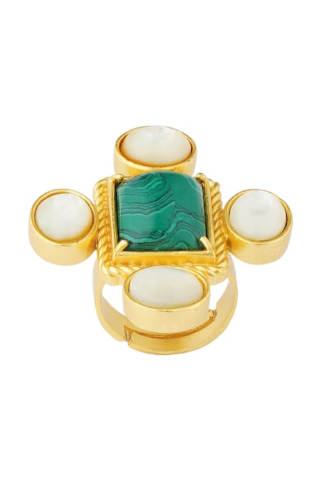 Gold adjustable statement ring featuring a central green motif and four white embellishments