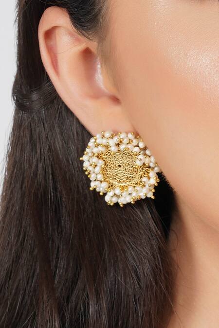 Gold stud earrings featuring intricate cutwork design and adorned with fresh water pearl drops