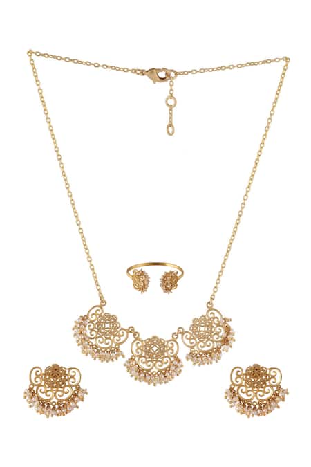 Gold jewellery set featuring a necklace with filigree cutwork motif pendants and cluster pearl drops. Includes matching stud earrings and an adjustable cuff bracelet.