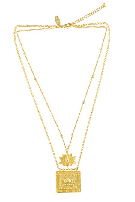 Gold pendant necklace featuring a lotus carved motif and a rectangular design