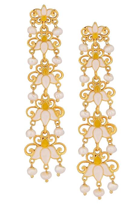 White Beads, Pearls Lotus Garden Enamelled Dangler Earrings