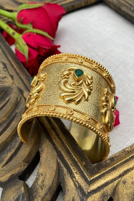 Embossed peacock motifs, Chatham emerald embellishments, Openable cuff design