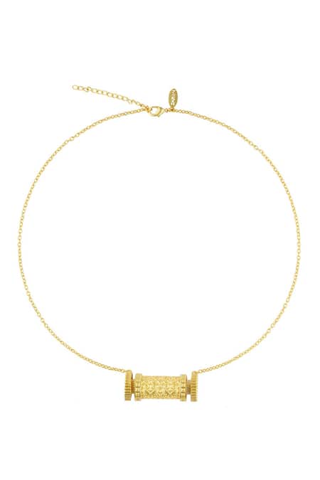 Gold pendant necklace featuring an embossed cylindrical scroll center motif