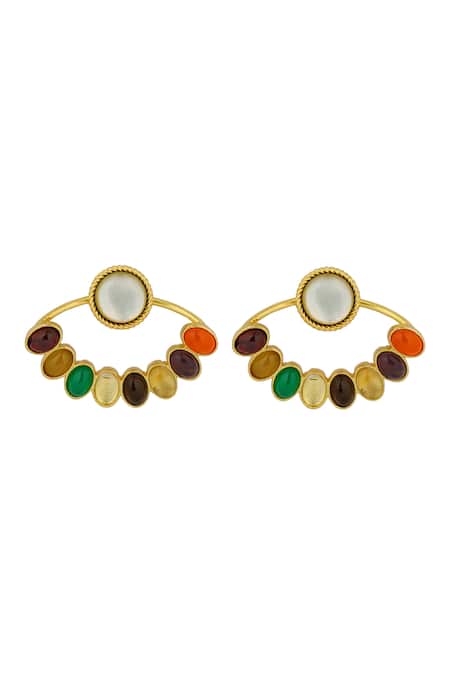Multicolor stone studded earrings featuring a combination of garnet, crystal quartz, carnelian, glass cats eye, amethyst, mother of pearl, green onyx, citrine, and smoky quartz