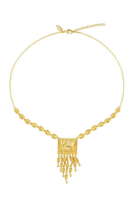 Gold pendant necklace featuring embossed elephant and lotus motifs with bead drops and tassels