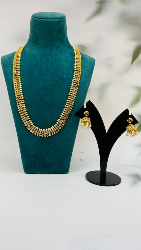 Intricate temple carving on necklace, Stone embellishments on earrings
