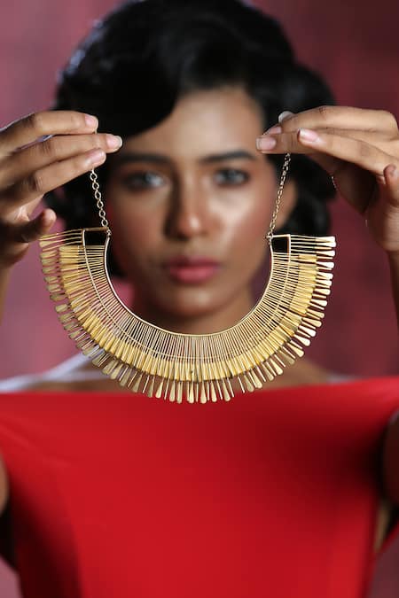 Gold neck piece crafted from brass featuring a contemporary design with a length of 8 inches and width of 2 inches