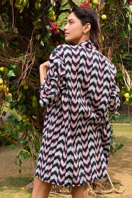 Black Cotton Satin Open Neck Antalya Brazen Arrow Print Jacket Shorts Set