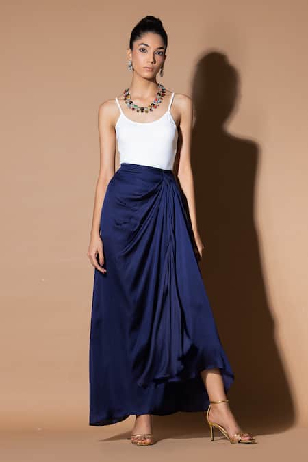 Navy blue modal satin wrap skirt featuring an asymmetric hemline and side slit