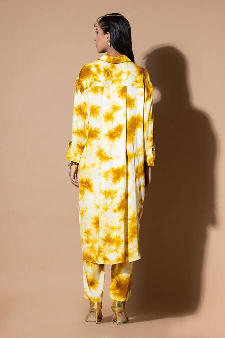 Yellow kurta in modal satin featuring a tie-dye pattern with hand embroidered floral and sequins work. Paired with a straight pant.
