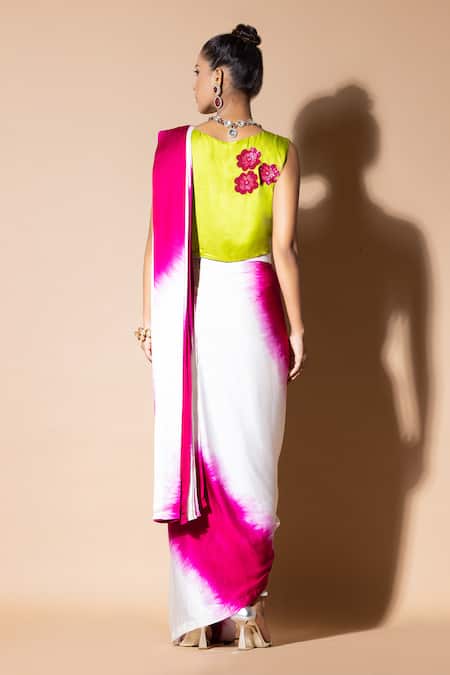 Pink ombre modal satin pre-draped saree with pleated detailing. Paired with a lime green floral and sequins hand embroidered crop top.