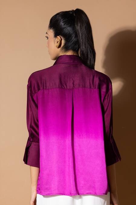 Purple modal satin shirt featuring collar neckline, three-quarter sleeves, and front button closure