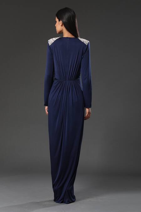 Buy_Zeefaa_Blue Turkish Lycra Pearls Round Shoulder Embellished Draped Gown_Online_at_Aza_Fashions