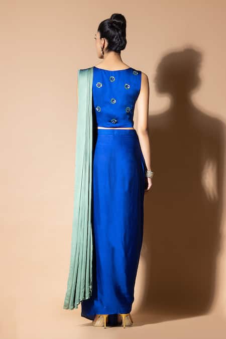 Celestial blue & green ombre modal satin pre-draped saree with pleated detailing