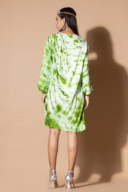 Green Modal, Satin Sequins Round Neck Tie-dye Pattern Dress