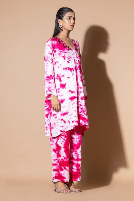 Magenta kurta featuring a V neck, full sleeves, and floral sequins hand embroidery. Paired with a straight pant in a matching tie-dye pattern.