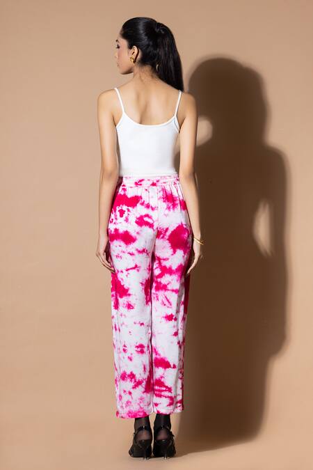 Magenta straight pant crafted from modal satin featuring a tie-dye pattern and side pockets