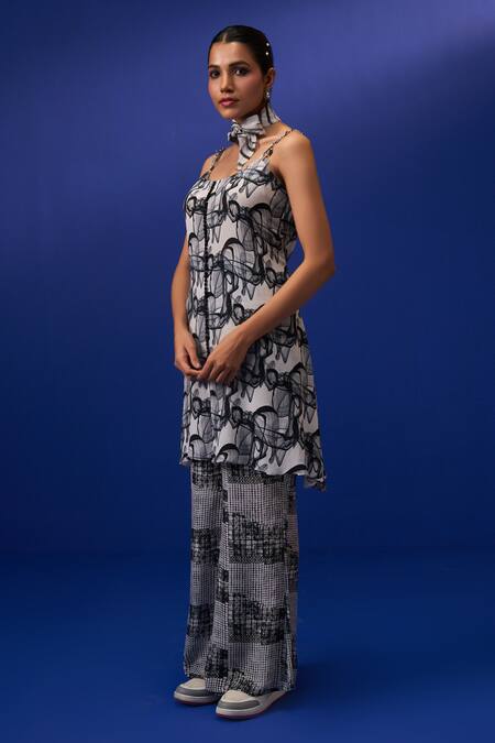 Black and white kurta featuring sleeveless design with all over helix maze print and beaded tassel details. Paired with geometric print flared palazzo for a stylish look.