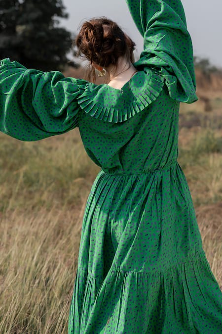 Green Textured Crepe Dot Peter Pan Collar Megan Print Dress