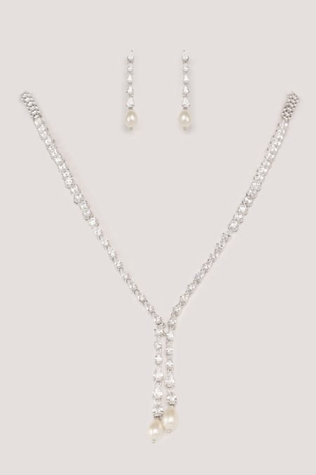 Pearl drop accents on both necklace and earrings, Classy diamond arrangement in the necklace