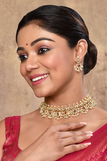 Gold choker necklace featuring crescent and vintage cut work pattern with ruby jadau stones and pearl border. Paired with embellished dangler earrings adorned with similar stones and pearls.