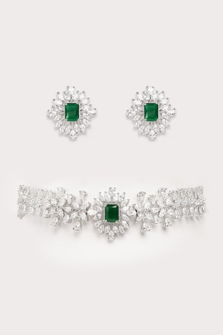 Green designer necklace featuring faux diamond embellishments and a matching pair of earrings. Crafted from a silver and copper mix with a white finish plating.