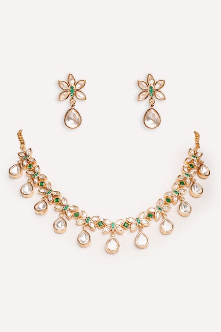 Green necklace featuring Kundan and Polki stones with a gold finish. Paired with matching earrings adorned with floral motifs and teardrop embellishments.