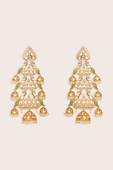 Intricate Kundan and Polki stone detailing, Gold finish with vibrant green accents, Dangling jhumka elements for added movement