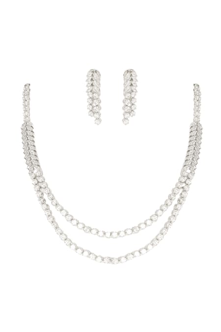 White finish double layered necklace embellished with faux diamond stones. Paired with matching earrings featuring similar faux diamond embellishments.