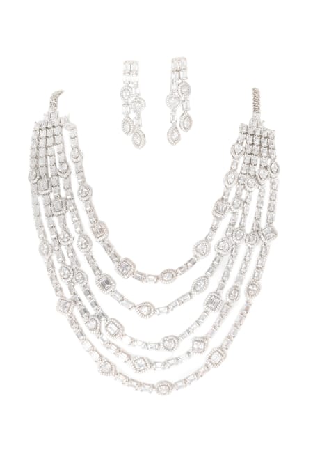 Layered design with multiple strands, Diamond embellishments in various shapes, Push back clasp for earrings