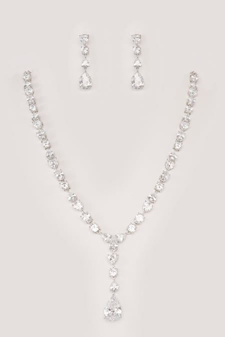White finish diamond pendant necklace featuring a teardrop design with matching earrings. This set offers a luxurious appeal suitable for various occasions.