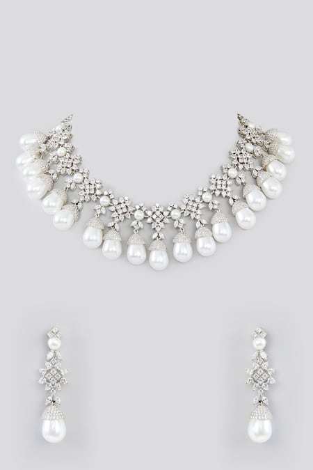 White choker necklace featuring faux diamonds and chunky pearl embellishments. Paired with matching faux diamond encrusted pearl drop earrings.