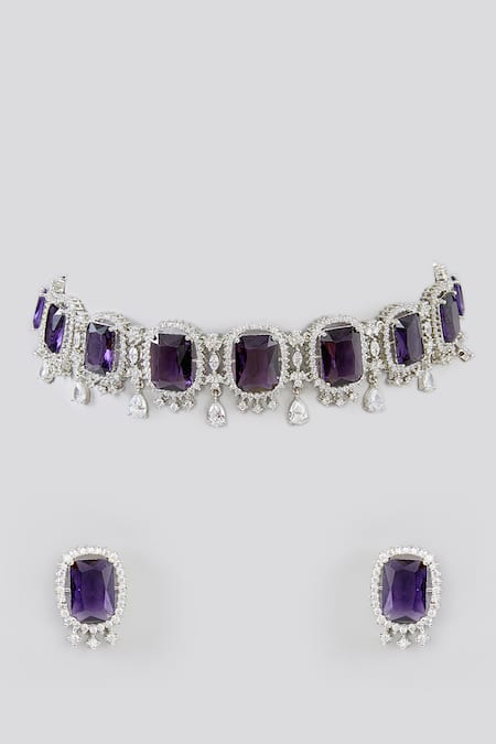 White finish necklace featuring faux diamonds and blue stones. Paired with matching faux diamond encrusted stud earrings.