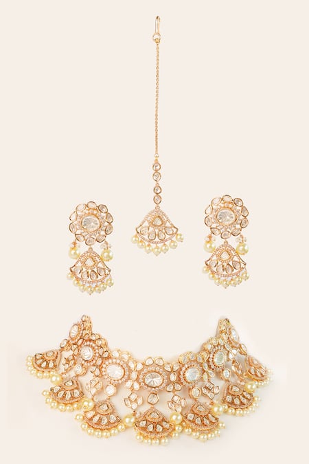 Gold floret cutwork choker featuring kundan, polki embellishments and pearl drops. Paired with matching earrings and maangtikka for a complete look.