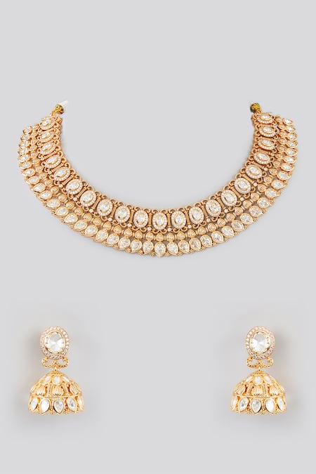 Gold plated necklace featuring gleaming leaflet design with kundan and stone embellishments. Paired with a matching pair of jhumka earrings.