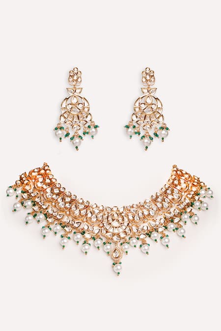 Gold necklace featuring Kundan and Polki stones with pearl embellishments. Paired with matching earrings adorned with similar stonework and pearls.