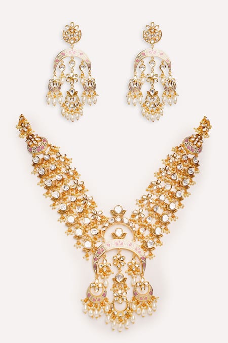 Intricate Kundan and Polki stone arrangement, Two-tone finish for added elegance, Delicate pearl drop embellishments