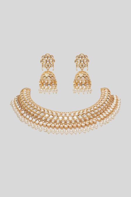 Gold toned Hexagon jaal necklace featuring kundan, pearls & polki embellishments. Paired with a matching pair of dome shaped jhumkas.