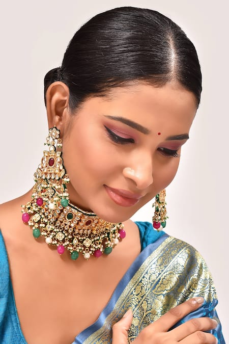 Gold Plated Stones, Pearls Kundan And Embellished Choker Necklace Set