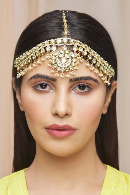 Gold mathapatti featuring crescent moon-teardrop motifs with cluster pearl drops