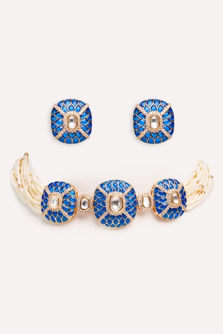 Blue necklace featuring Kundan and Polki stones with a silver and copper mix base. Paired with matching earrings adorned with similar stone embellishments.